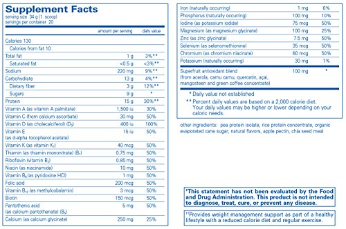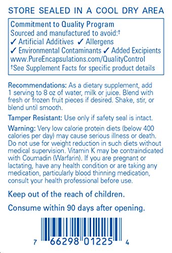 -. Feature : Vegetarian protein, vitamins, minerals, omega-3 fatty acids and superfruit antioxidants for healthy weight management. / WARNING: Very low calorie protein diets (below 400 calories per day) may cause serious illness or death. / 680 Grams / Pure Encapsulations recommends 1-2 servings daily. Add 1 serving to 8 oz of water, milk, or juice. Blend with fresh or frozen fruit pieces if desired. Shake, stir, or blend until smooth. / At Pure Encapsulations, our products are free from: wheat and gluten; egg; peanuts; coatings and shellacs; GMOs; magnesium stearate; trans fats and hydrogenated oils; artificial colors, flavors and sweeteners; unnecessary binders, fillers and preservatives. Any product containing ingredients derived from allergens, such as soy, dairy or shellfish, is clearly labeled.