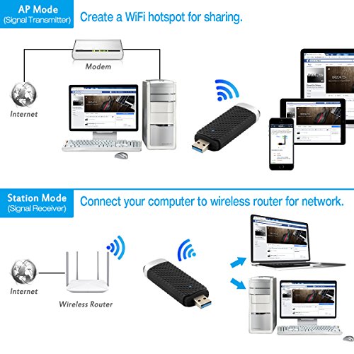 Studio : DIZA100 Publisher : DIZA100 Binding : Electronics Product Description NOTE: 1.This product offers AP Mode and Station Mode for your option, but not mean you can run both modes synchronously, besides, the MAC system does not support AP Mode. Also, you can only connect to 2.4G WiFi or 5.8G WiFi separately, not both at the same time. 2. Install the driver from CD first before you insert the WiFi adapter 3. Restart your computer after driver installation 4. If your computer is desktop, we suggest that you'd better insert the WiFi adapter into the back USB port of you PC, that may guarantee the power supply 5. If you can't read the CD software, you can download the driver software here: https://goo.gl/X1jF6V