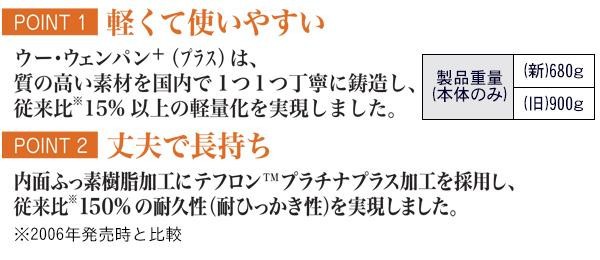 | 素材・材質 | 【本体】アルミニウム合金(AC7A)、内面:テフロン(TM)プラチナプラス加工、外面:ふっ素樹脂塗装 【蓋、スチームトレー】アルミニウム合金 【蓋ハンドル】フェノール樹脂 【ハンドル】天然木 |
