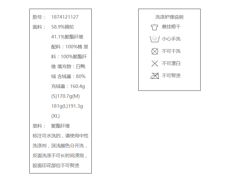 58.9%锦纶 41.1%聚酯纤维 配料:100%棉 里料:100%聚酯纤维 填充物:白鸭绒 含绒量:80% 充绒量:160.4g(S)170.7g(M)181g(L)191.3g(XL)