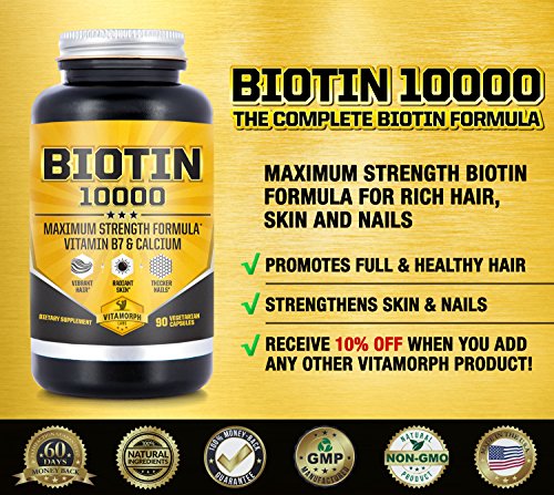 -. Feature : Stronger Hair Skin & Nails - Get the most out of your biotin with Biotin 10000 - This all-natural formula helps improve the thickness & vitality of your hair, skin, nails! / What's Inside? - 90 vegetarian capsules of biotin vitamin b7 + calcium - 45-Day Supply! / Added Benefits - Water-soluble vitamin b7 biotin also benefits intermediate metabolism function & nerve health - science-backed ingredients! / Full Product Satisfaction - 100% satisfaction for all customers who try this hair, skin, & nails biotin formula! / Why Vitamorph Labs? - Great deals, complete programs, effective dosages - Check your bottle for details!