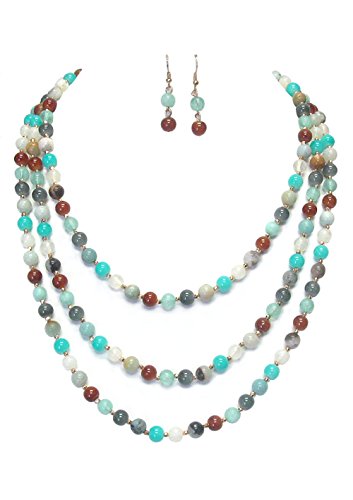 72 inch multicolor flapper length claspless round opaque and translucent bead necklace in shades of sea foam green, teal, variegated brown, marbled gray and off-white, with small gold-tone spacer beads.