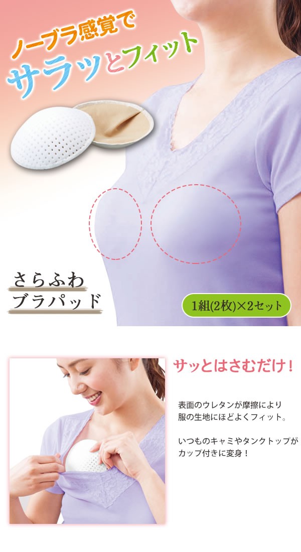 | お手持ちのキャミやタンクトップに挟むだけでカップ付きインナーに変身!カップはウレタン素材で服との摩擦により落ちにくくなっています。また表面は穴あきで通気性が良く、肌に触れる内側は吸水速乾生地でサラッとした着け心地。ノーブラ感覚でリラックスタイムにおすすめです。 |
