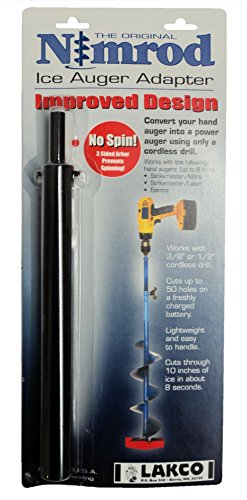 Studio : Lakco Publisher : Lakco Binding : Misc. Product Description Nimrod Ice Auger Adapter - Fits Mora Lazer Strikemaster Auger the Eskimo auger - Works Best With Nimrod SmartHandle - Just for new pin systems, not a threaded handle - It is loose on the HT auger and is not recommended. - 8-3/4" long - 3/4" chuck where you connect auger drill - 3/8" chuck where you connect drill - Convert your hand auger into a power auger using a cordless drill! - Works with 3/8" or 1/2" cordless drill - Cuts up to 50 holes on a single battery charge - Cuts through 10" of ice in about 8 seconds - Three-sided arbor prevents spinning - Made in Michigan for Lakco - An amazing product!!! - A must for the Ice Fisherman!!! - You can use any 18 volt cordless drill (or larger 19.2 is also good), does not matter what brand, but has to be 18 volt (or larger), not 12 or 14 volt. (NOT recommended for lower than 14.4 volt drills.) - NOTE: This is for adapter only, auger drill are not included! This is only so you know how it works! - NOTE: We have sold about 5000 of these over the past 7 years and only 3 people lost their augers. All three were when the guys put the drill in reverse; this loosens the drill bit. - **DO NOT flip from Forward to Reverse to back auger out of hole!!!** - DO NOT PUT DRILL IN REVERSE: PULL AUGER CHUCK UP!! 0