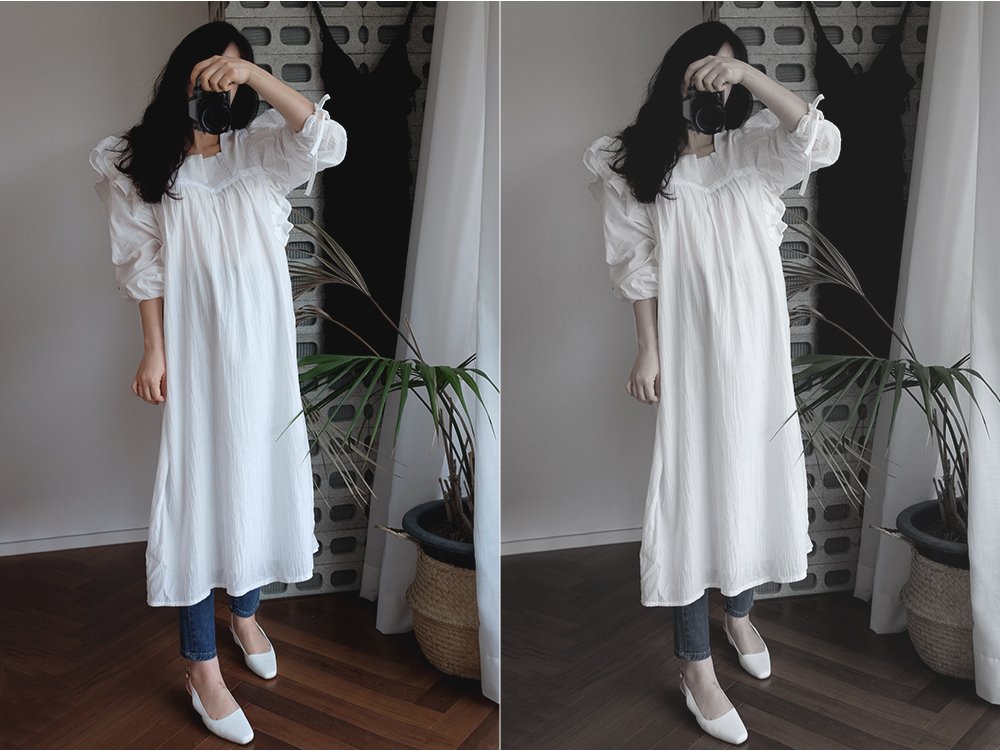 밑단까지 A라인으로 살짝 퍼져 무릎을 충분히 덮어주는 기장감이에요!