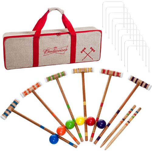 Studio : TMG Publisher : TMG Binding : Misc. Product Description Get out and enjoy the beautiful weather with this handy Budweiser croquet set! Perfect for your next BBQ, picnic, party, or reunion! A great way to get family and friends together for endless fun! Features Include: 6 - 26 inch solid wood mallets with 1.85 inch diameter cushion-capped heads Budweiser carrying case to keep everything together 6 - 3 inch croquet balls Durable and long lasting design 2 Solid wood stakes 9 Wickets 6 Player action Coated weather protected wire wickets This item is Officially Licensed by Anheuser Busch, Budweiser. 0