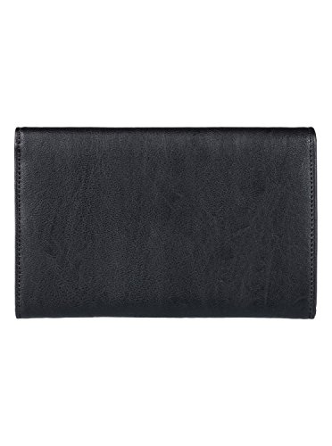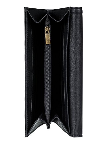 Faux leather wallet for women. Features include: faux leather, deboss artwork on the front panel, metal snap closure, interior zip, card slots, Roxy metal plaque and size: 4.72 [h] x 7.48 [w] x 1.377 [d]/12 [h] x 19 [w] x 3.5 [d] cm.
