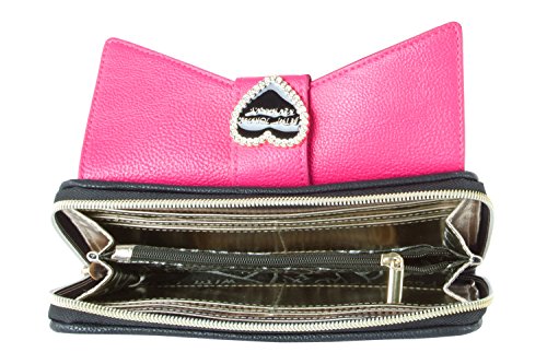 For the perfect blend of fashion and function, get the stylish Signature Bow Wallet By Betsey Johnson Its constructed of quilted pvc leather and finished with Betsey signature logo, The wallet features front flapover pocket, main zipper closure with 8 CC slots, 2 bill slots, Id window and center coin pocket, It's compact yet perfect for keeping your stuff organized!!