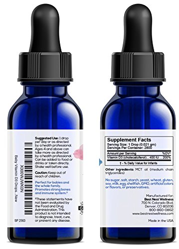 - Feature : ♥ MAKE SUPPLEMENTATION HASSLE FREE Stain-free, taste-free vitamin D drops make meeting the nutritional needs of breastfeeding babies & toddlers easy / ♥ A PERFECT DOSE Every drop provides 400 IU of vitamin D / ♥ THE NATURAL CHOICE Our supplement is free of artificial ingredients and suspended in unfractionated coconut oil / ♥ PREMIUM QUALITY LIQUID SUPPLEMENT To ensure that our supplement for kids & infants is as pure as possible, we only manufacture it at a GMP-approved facility in the U.S. / ♥ SATISFACTION GUARANTEED If you're not completely satisfied with our D drops supplement, we'll refund your money. Comes with a beautiful FAQ Poster