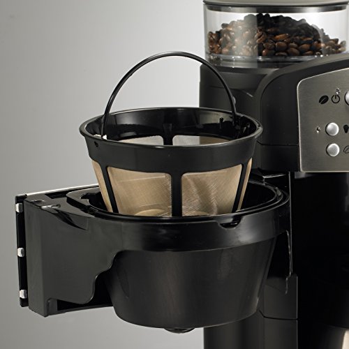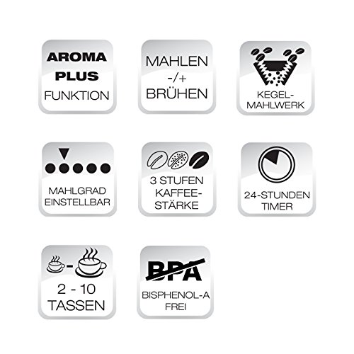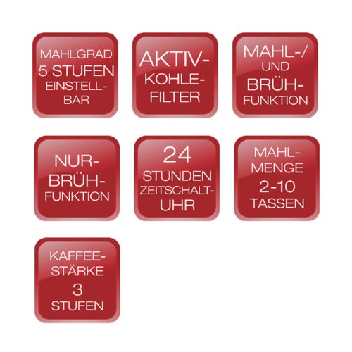 -. Feature : Wahlweise mit Mahl & Brüh- oder nur mit Brühfunktion / Mahlmenge von 2 - 10 Tassen per Knopfdruck einstellbar / Kaffeestärke in 3 Stufen per Knopfdruck einstellbar / Mahlgrad in 5 Stufen einstellbar / Mahlt die gewünschte Menge an Kaffeebohnen und transportiert den gemahlenen Kaffee zum Filter