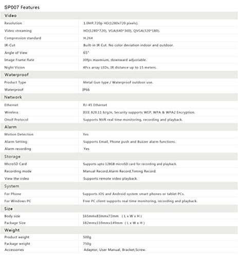 -. Feature : ♥High- performance System:Magnificent High Definition CMOS sensor 1-Megapixel /HD 720P (1280*720 ),VGA(640 x 360), QVGA(320 x 180),H.264 Video at 30 fps .With CE, FCC & RoHS Certification. / ♥Supports up to 128GB microSD card or,and support iOS/Android Smart phone or Windows PC for Motion Detection & alarm recording and playback. with Onvif Protocol NVR real time monitoring, recording and playback:Recognizing what is happening in your house or outside garden easily and quickly even when you are hundreds miles away form home. / ♥Outdoor IP66 Waterproof: Surveillance Bullet camera with waterproof up to IP66 degree, which could withstand extreme tough outdoor conditions. Making up with great quality housing,perform well in any kind of wind and rain to delivery the protection you need. / ♥Stunning Night Vision:Equipped with with 4 Pcs array LEDs, the camera will show you clear picture even in total darkness,extending your night vision up to 150 meters away. Built-in IR Cut, no color deviation indoor or outdoor. All thing under monitored,the dark never bother you anyway. / ♥Item Type:ipcamera/home camera/baby monitor/wifi camera/waterproof camera/security camera/home security camera system wireless/wireless security camera/outdoor wireless security camera/wireless security camera system/cctv cameras/ipcamera wireless/surveillance camera/wireless cameras for home security.
