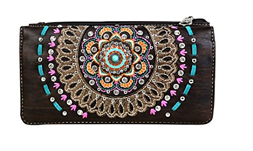 -. Binding : Apparel -. Brand : Montana West -. Department : womens -. Feature : Wallet approx 8" x 3.75" x 1" / Button closure on front section to hold cards / Zipper closure pocket on back with single compartment -. ProductGroup : Apparel -. ProductTypeName : ACCESSORY -. Size : Regular -. Title : Montana West Aztec Flower Floral Rhinestone Turquoise Concho Wallet Jp Orange Pink