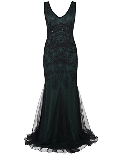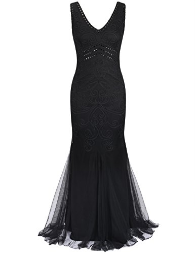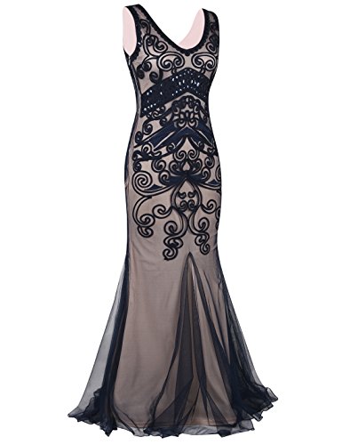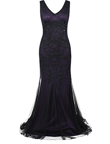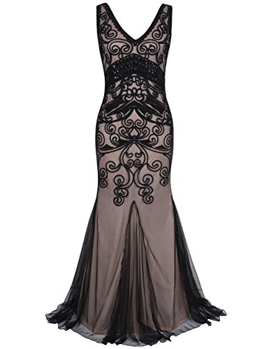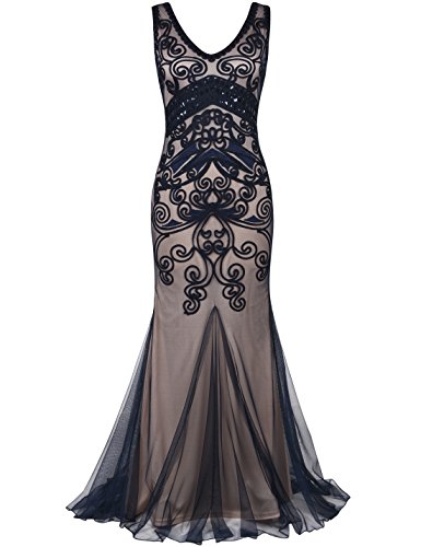 Dress like a pricess,elegant and glitter.Featuring a sexy v neck,in a proper right deepth,elegant and glamous. Using large quantity of braided rope to make variety of shapes,beautiful paisley and other marvelous geometric designs,visualized and lifesome geometric solid,can cater to modernist's aesthetic.Below the bust,art deco with some black sequins,and the most important feature- handmade embroidery descended into it,classic themes,but with a contemporary element,exquisite style,look lithe and graceful.In the bottom, with a mermaid hem design,look gorgeous.The whole dress reflects the understated elegance with a stronge feeling of the individuality.Come with this charming dress to attend the 1920s wedding,party,formal ocassion or other special occasion.Feature