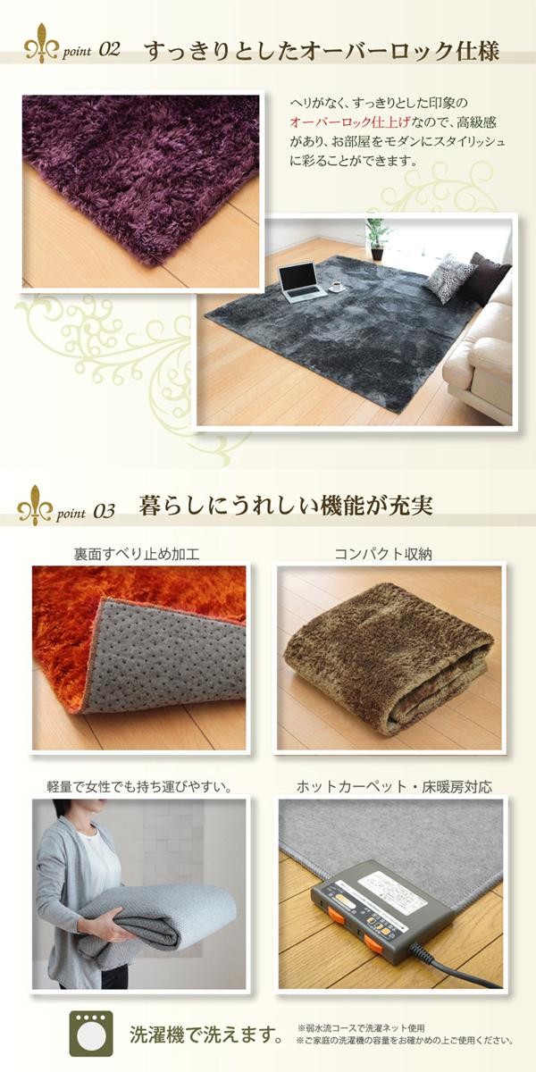 お部屋に合わせやすい高級感あふれるオーバーロック仕様のラグです。裏面には滑りにくい加工を施しているためフローリングでも安心してご使用いただけます。 |