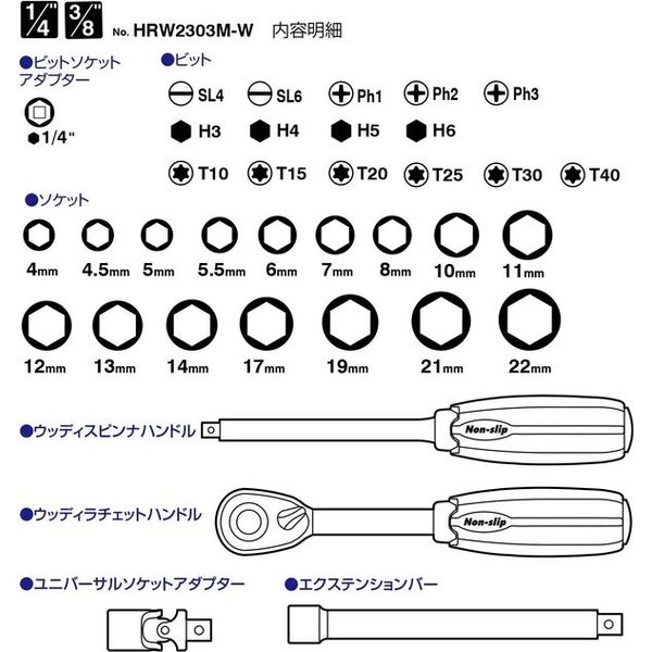 ●セット内容2:1/4”sq(ソケット:4 4.5 5 5.5 6 7 8mm) 3/8”sq(ソケット:10 11 12 13 14 17 19 21 22mm)