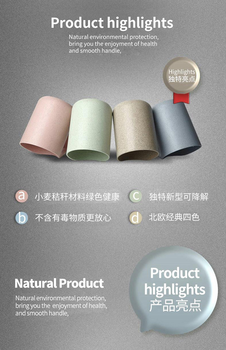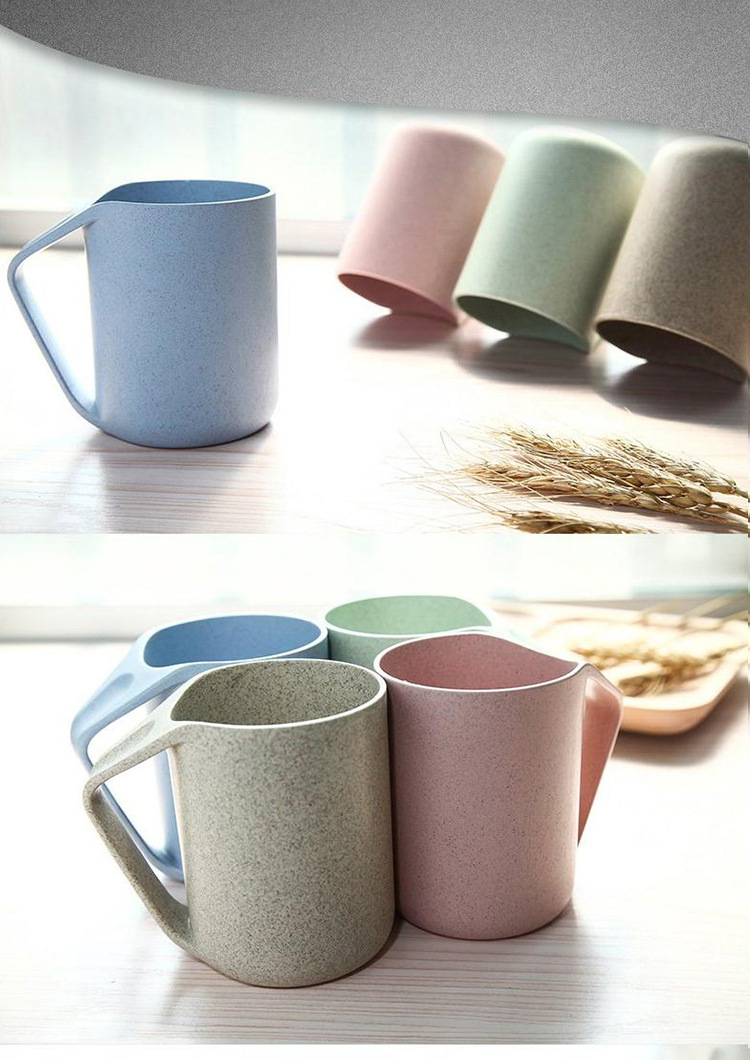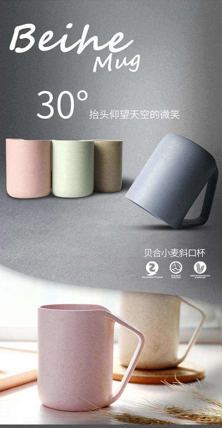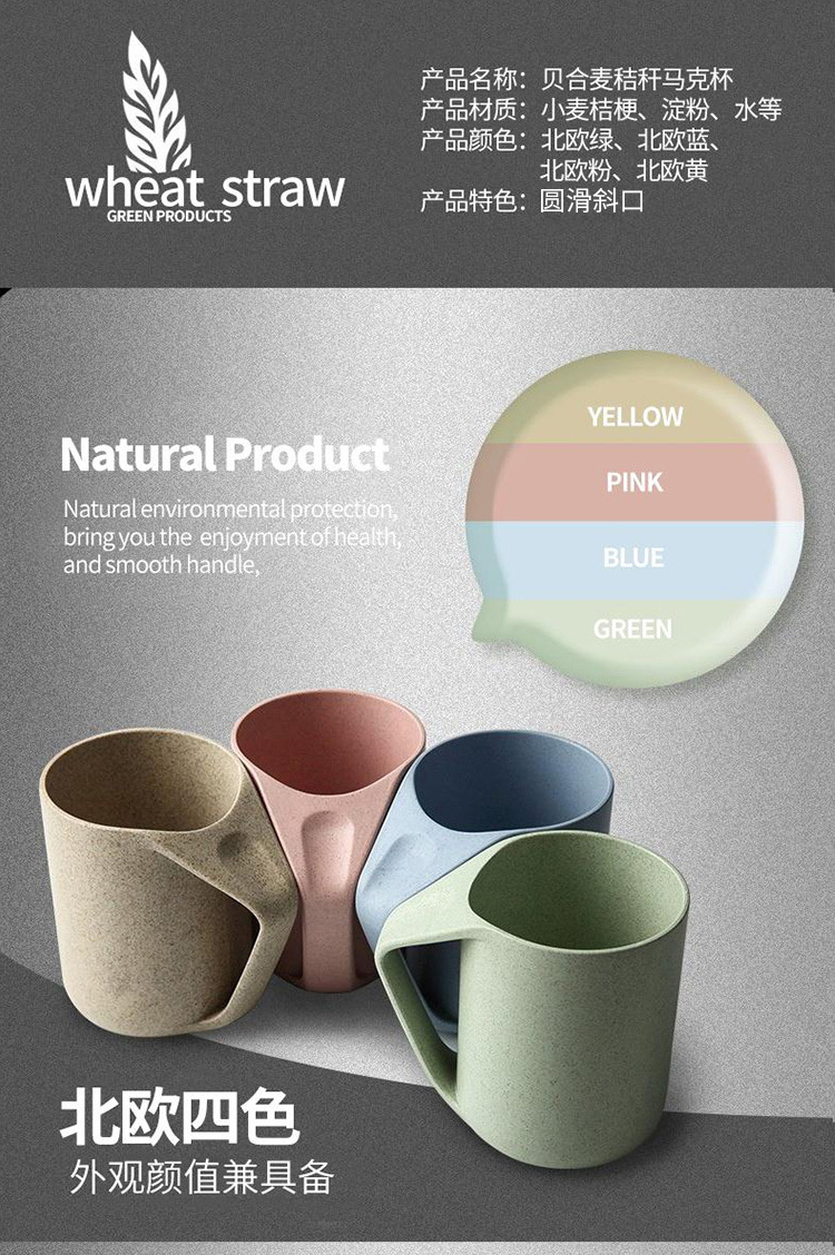 本宝贝描述均属于实物拍照,产品图片仅供参考;本款宝贝采用绿色环保小麦材质,小麦秸秆+淀粉+定型机(pp)含有50%的pp成分,实质是一种生物塑料,与工程塑料是不同的,无毒健康的材质,更环保哦;杯子采用倒扣设计,快速晾干杯底,干净透气,不滋生细菌哦;杯柄设计贴合拇指凹槽,更舒适贴心呢。四色可选,量大可丝印logo哦,为广告产品的不二选择。我司提供单独定制化服务,提供混批服务。更多详情可咨询在线客服!!!u0026nbsp;