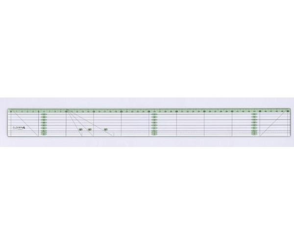 背景に色をつけることで、目盛や数字の入っている箇所がひと目で分かり、濃い色の布地や柄物の布地の上でもより見やすくなりました。また、定規の端の目盛の背景「カラーライン」は、縫いしろ幅にあわせた7mmなので、縫いしろをとる作業も楽にできます。製図、型紙作り、キルティングライン、印つけなどペンを使っての作業に最適なすっきり見やすい平行線&角度線が入ったシンプルな定規です。 |