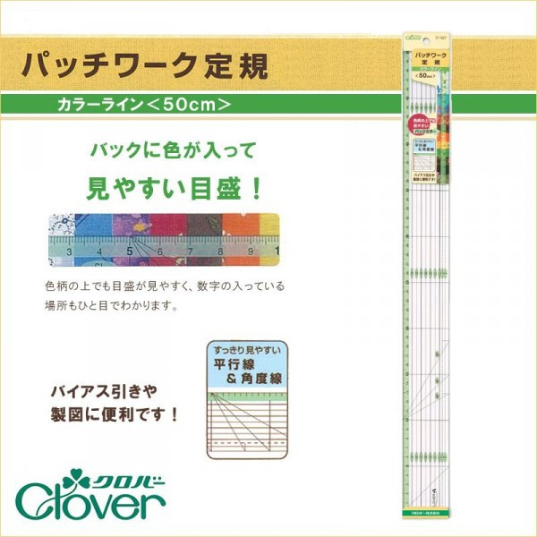 | 背景に色をつけることで、目盛や数字の入っている箇所がひと目で分かり、濃い色の布地や柄物の布地の上でもより見やすくなりました。また、定規の端の目盛の背景「カラーライン」は、縫いしろ幅にあわせた7mmなので、縫いしろをとる作業も楽にできます。製図、型紙作り、キルティングライン、印つけなどペンを使っての作業に最適なすっきり見やすい平行線&角度線が入ったシンプルな定規です。 |
