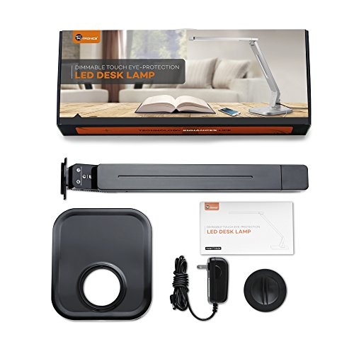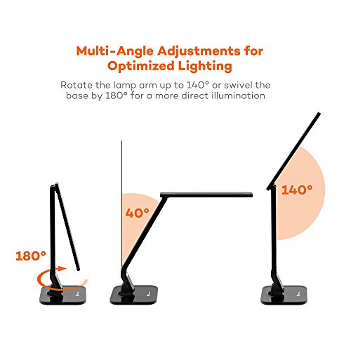 Overview: TaoTronics Elune TT-DL01 (black) is the new generation energy-saving and eco-friendly LED desk lamp. Featuring adjustable mood lighting and five different shades, the elegantly designed Elune is perfect for those late night reading sessions. Built for portability and light sensitive eyes, the Elune is the number one choice for the home, office, study or even the bedside table. Durable: - long lasting LED lights means it's the only lamp you'll need for the next 25 years. - durable hard shell plastic comes in a piano black finish. Convenient: - elegant foldable design, occupies less space. - 18 inch tall, fits well with pc monitor, no glare on screen - 5V/1a USB charging port for your mobile phone or tablet, 60Min auto-off timer - 4 lighting modes: * read: cool white light helps enjoy reading without eyestrain * study: brightest light, ideal for those late night cram sessions * relax: cozy warm light drives stress away * sleep: bathe in the warm light as you nod off -5 level brightness, simply touch the "+/-" to get ideal light what's in the box: - 1 x TaoTronics LED lamp - 1 x Adapter - 1 x cleaning cloth - 1 x quick installation guide.Feature