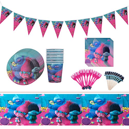 -. Feature : This party pack for trolls is perfect for a child's birthday party or trolls party. / (1) Trolls - Table Cover ,(1) Trolls Banner / (10) Trolls plastic Fork - (10) Dessert plates / (10) Trolls - Lunch Napkins,(10) Trolls - 9 oz Cups / (10) Trolls Cake Topper