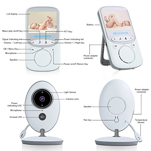 Studio : Talent Star Publisher : Talent Star Binding : Baby Product Product Description The video baby monitor enables you to always keep an eye on your baby! Hear your baby with crystal clear sound quality! 2.4 Inch High-contrast LCD Monitor Equipped a 2.4 inch LCD screen and connected to the baby camera via enhanced 2.4GHz wireless technology, clearly show our babies without Wi-Fi interference. 2-Way Talk Back You could talk back to your baby to comfort him/her via talk button when he/she is crying. Makes it convenient for parents to see baby anytime! Unobstructed Effective Range Using enhanced 2.4GHZ wireless technology which prevent signal drop outs. The monitor covers a transmission range of up to 160ft/50m indoor, 850ft/260m outdoor without barriers. Temperature display With temperature sensor, supervise baby's room temperature all the day, help to care your baby's health. Super Clear Video Sound Picture The video baby monitor has great video and sound. Allows you to care your babies in dark, keeping an eye on baby all night with automatic night vision. Long Battery Life Up to 24 hours in VOX mode Multiple Languages Support English / French / Spanish / Portuguese / Italian / German / Turkey / Russian Monitor/Parent Unit: - LCD Size: 2.4 Inch - Resolution Supported: 320 x 240 pixel - Receiving sensitivity: -90dBm - Battery: Li-polymer 750mAh - Power Supply: 5V / 1000mA DC Camera/Baby Unit: - Image Sensor: CMOS - Total picture pixels: 640 x 680 - Minimum Illumination: 0 Lux(IR on) - Night Vision Distance: 15ft (5m) - View Angle: Diagonal 45° - Power supply: 5V / 1000mA DC Package Included: 1 x Parent Unit 1 x Baby Unit 2 x Power adapter 1 x User Manual