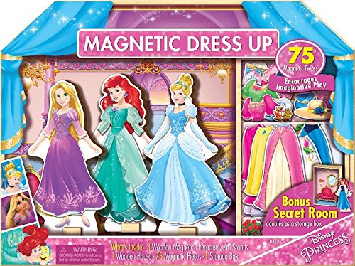 Studio : Melissa and Doug Publisher : Melissa and Doug Binding : Toy Product Description Includes (3) Wooden Magnetic Characters with Stands, (1) Wooden House, (75) Magnetic Pieces, (1) Storage Box / Bonus Secret Room doubles as a storage box / Dress Cinderella, Rapunzel, and Ariel in the magnetic clothing accessory pieces / Play in your beautiful princess doll house 0