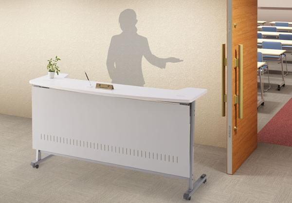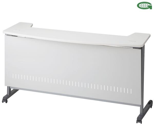 | 会議や式典、説明会などの際、いつもの会場の前に手軽に受付カウンターが設置できる上品なホワイトカラーの移動式インフォメーションカウンター。受付業務など簡単な作業がしやすい中棚付♪使わない時は折り畳んで収納可能です。 |