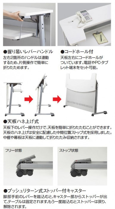 会議や式典、説明会などの際、いつもの会場の前に手軽に受付カウンターが設置できる上品なホワイトカラーの移動式インフォメーションカウンター。受付業務など簡単な作業がしやすい中棚付♪使わない時は折り畳んで収納可能です。 |