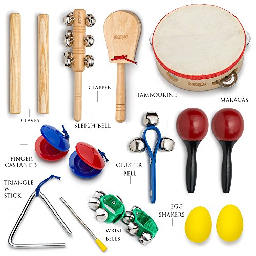 To provide hours of enjoyment, this set includes a pair of maracas, small and large sleigh bell, triangle with striker, tambourine, handle castanet, 2 finger castanets, 2 shaker eggs, 2 wrist bells and 2 claves. A zippered carrying case and practical bag allow for easy cleanup, transport, and storing the set away when it’s not being used.