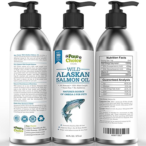 -. Feature : OMEGA-3, EPA & DHA, WITH NATURALLY OCCURRING VITAMINS AND ANTIOXIDANTS. Unlike many other sources, wild salmon oil is a nutritional powerhouse of naturally occurring minerals, vitamins, and powerful antioxidants, like astaxanthin and vitamin E. These important veterinarian-recommended omega fatty acids help promote healthy skin, coat, heart, joints, immune system and brain function, in addition to helping reduce inflammation. Our oil is in the superior Triglyceride form. / UNBEATABLE QUALITY & SAFETY. Our oil is from 100% wild-caught, never farmed, non-GMO Alaskan salmon using sustainable fishing practices. It is cold pressed, and refined to be free of pollutants and toxins, like mercury, and bottled in the USA in an FDA registered and GMP certified facility. We also get our oil 3RD PARTY TESTED after bottling to verify freshness for your furry family (see listing pics). / SPECIAL PLASTIC-FREE BOTTLE eliminates the possibly of nasty chemicals from plastic leaching into the oil and contaminating it. Our brushed aluminum bottles are also superior at keeping out light and air, both of which can degrade the oil quality. They are easily recyclable and more environmentally friendly. / A TASTE YOUR PET INSTINCTIVELY LOVES, EASY TO USE & NO MESS. Many wild animals rely on eating salmon for their health and strength. Your pet can now get the same powerful health benefits with a rich fish taste they naturally love. Our pre-measured pump makes for quick use with no leaking, dripping or mess. / 100% SATISFACTION GUARANTEED FROM PAW CHOICE. When you order today, you're protected by a 30 day, no questions asked satisfaction guarantee and our world-class customer service!