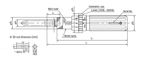 - Feature : Adjustable torque setting by twisting shaft with main and supplementary scales. For Clockwise tightening only / Lock ring holds selected torque value in place and a click alerts user that torque set has been achieved / Rotary slip mechanism prevents over torque by ratcheting after click. Accuracy +/-3% of indicated value / Accepts 1/4 hex bits (not included) / Includes Certificate of Calibration (NIST Traceable Cert offered for additional fee)