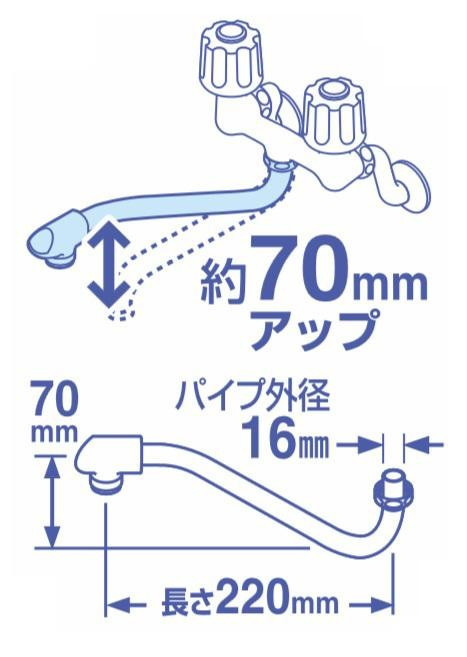 まっすぐのパイプより約70mm上にアップしているので、流しを広々と使えます。 製造国:日本 素材・材質:青銅 ※サプライヤー直送品 ご注文後2~3営業日後の出荷となります