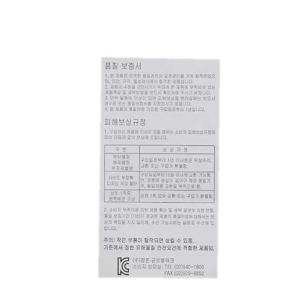 품질보증기준 : 관련법규와 관련규정에 의하여 보증함