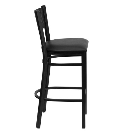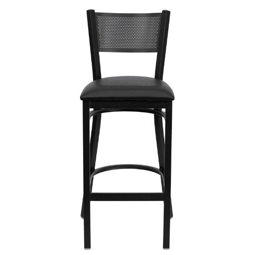 -. Feature : Heavy Duty Restaurant Bar Stool / Grid Back Design / Black Vinyl Upholstered Seat / 2.5'' Thick 1.4 Density Foam Padded Seat / 18 Gauge Steel Frame