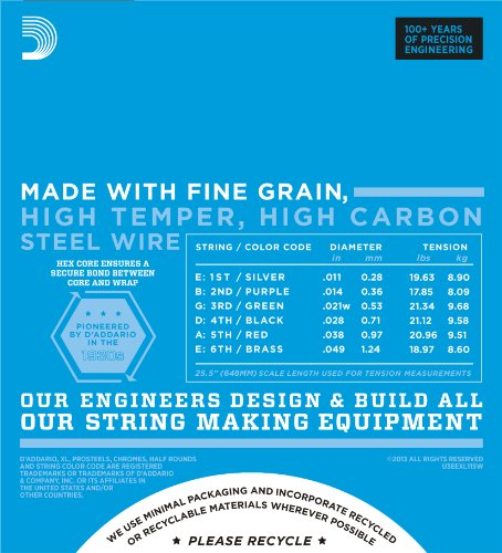 - Feature : Popular XL115-gauging with a wound 3rd string / Round wound with nickelplated steel for distinctive bright tone / Corrosion resistant packaging for strings that are always fresh / String Gauges: Plain Steel .011, .014, Nickel Wound .021, .028, .038, .049 / Made in the U.S.A. for the highest quality and performance