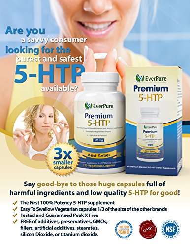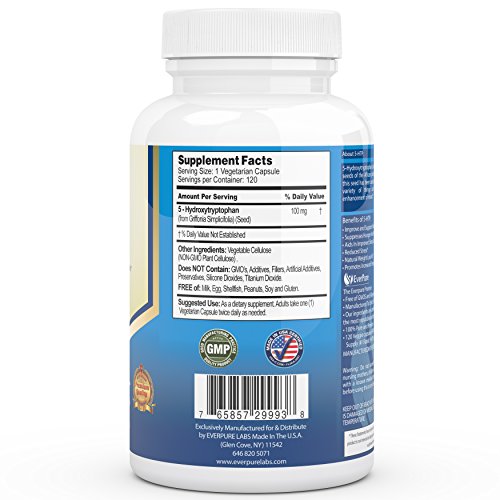 -. Binding : Health and Beauty -. Brand : Everpure -. EAN : 0885822074213 -. Feature : WHAT IS 5-HTP? * 5 HTP is a building block of serotonin, the "feel good" neurotransmitter that regulates our moods, sleep cycles, and even influences our response to pain. Preliminary evidence sests that supplementation with 5-HTP may promote weight loss by helping to reduce appetite and caloric intake* / WHY EVERPURE? * If you are an educated and savvy consumer then you know exactly what you are looking for and you use a fine tooth comb to research the label of any product you buy. Our products are all Free of gluten, milk, peanuts, shellfish, and soy. That has NO additives, preservatives, GMOs, fillers, artificial additives, stearate's, silicon Dioxide, or titanium dioxide. Everpure is a company that was built by Health conscious consumers for health conscious consumers.* / CUSTOMERS SAY OUR 5-HTP is GREAT FOR * Appetite Suppressant | Decreased Anxiety | Supports Positive Mood | Controls Emotional Eating | Maintains Serotonin Levels | Promotes Healthy Sleep | Fibromyalgia | Maintains Mental and Emotional Wellbeing* / WHERE ARE EVERPURE PRODUCTS MADE? * All of our products are proudly Made in the USA. Everpure Labs is an NSF certified company and all products are made according to strict GMP standards.* / THE SMALLEST and PUREST CAPSULES AVAILABLE * Our 5 HTP supplement is not only pure with no additives but we went the extra step by making sure that our product is easy to swallow as well! Our capsules are not only stronger at 100% potency but they are 1/3 the size of the other 5-HTP on the market. EASY TO USE → As long as you take it everyday consistently, you will feel the awesome Mood elevating benefits and Appetite Control. 1-3 capsules can be taken on an empty stomach or after a small meal. Its that easy!* -. IsAdultProduct : 0 -. Label : Everpure -. Manufacturer : Everpure -. MPN : BSS-PHO-TY25476 -. PackageQuantity : 1 -. PartNumber : BSS-PHO-TY25476 -. ProductGroup : Health and Beauty -. ProductTypeName : PERSONAL_CARE_APPLIANCE -. Publisher : Everpure -. Studio : Everpure -. Title : Top Rated 5-HTP with No Harmful Additives - Supports Positive Mood - 5-HTP Controls Emotional Eating - Improves Sleep - *Free Ebook* - 3x Smaller Capsules - Safe For Vegans - 100mg - 120 Count -. UPC : 885822074213