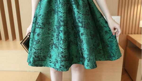 花柄刺繍ジャガード ノースリーブホルターネックドレス フレアワンピース グリーン/ L