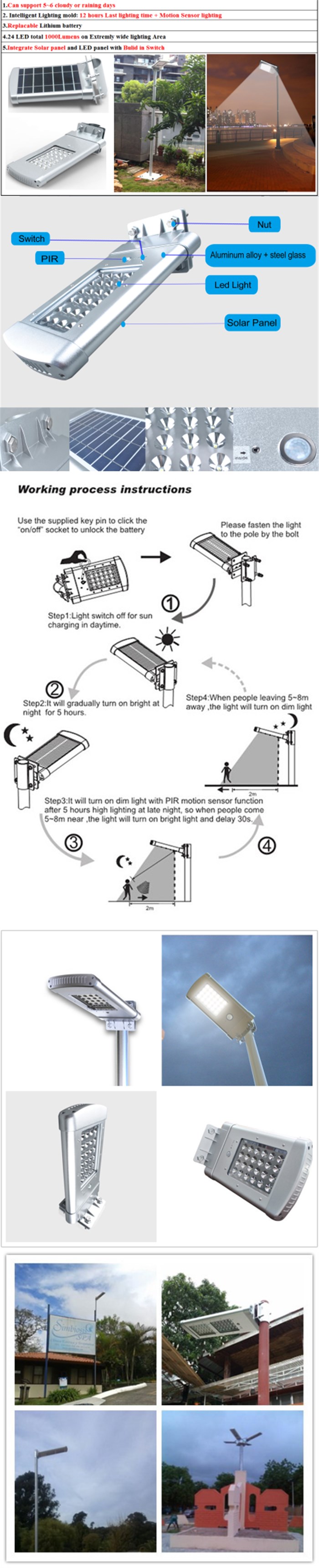 This solar LED light adopts polycrystalline silicon solar panel which can absorb sun array and convert it to electricity. It can be used even in cloudy or rainy days. It will auto turn on dim light mode when in darkness or at night, and auto turn off when in daytime or bright area. It will enter into bright light mode when people come and stay for 30 second after motion stops and then turn to dim light to save energy. Thisintegratedsolar motion light is waterproof and durable enough to last for years.