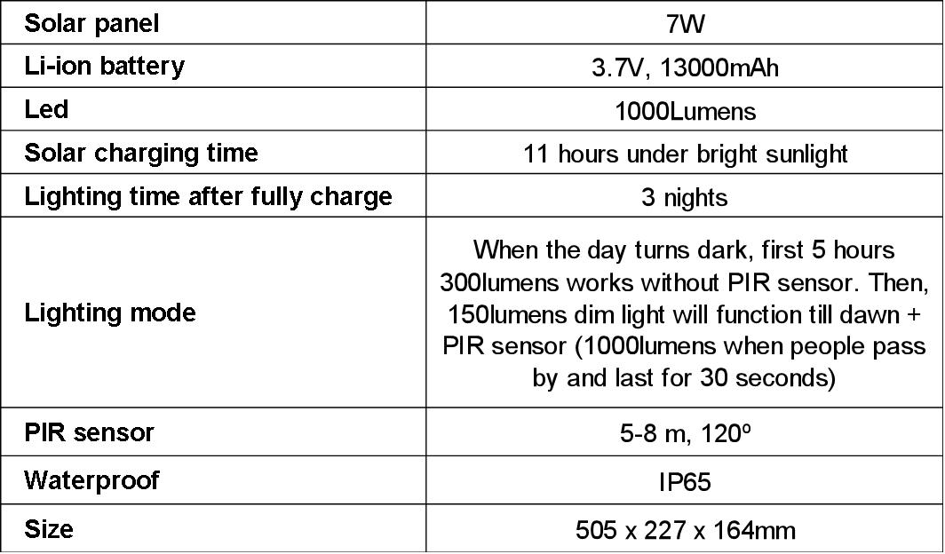 What's in the box: 1 setof 7W solar LEDlight withuser manual