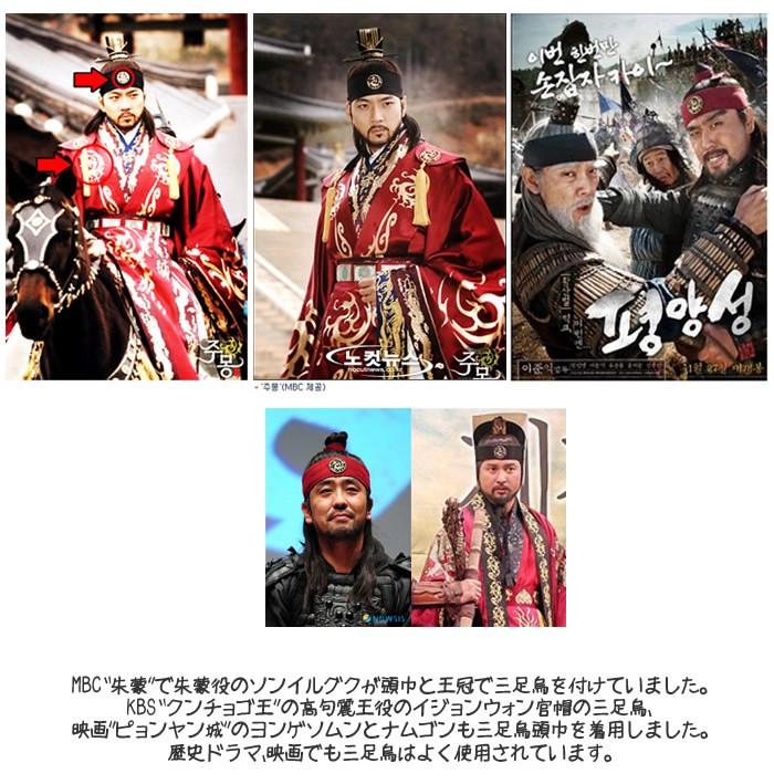 ドラマ朱蒙(チュモン)のオープニングに登場する三本足の烏は古代神話に出てくる、太陽の中に住むという鳥でチュモンの象徴となる鳥。中国の古典にある三足烏と呼ばれるもので、日の神=太陽をシンボル化したもの