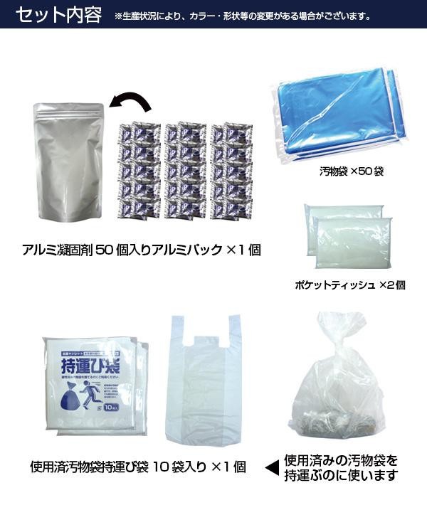 | セット内容 | 凝固剤(約15g)×50個、汚物袋×50袋、使用済汚物袋持運び袋×10枚、ポケットティッシュ×2個 |