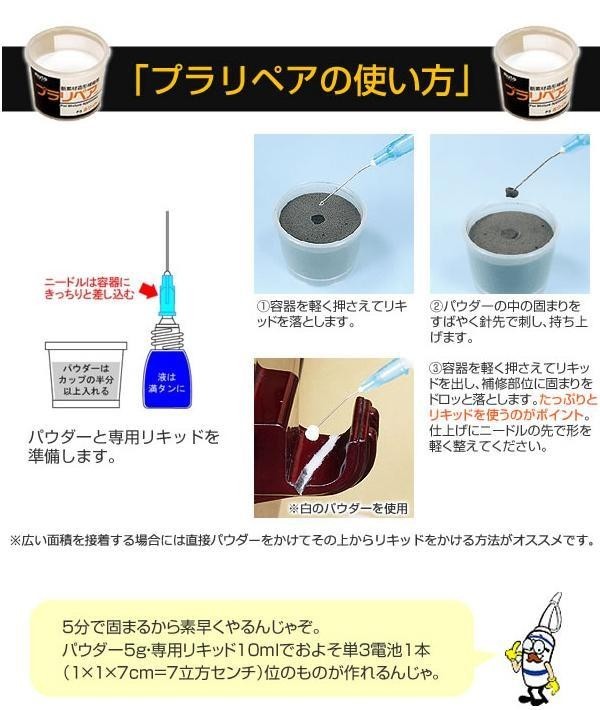 fk094igrjsプラリペア補充用粉です。別売りのプラリペアリキッドと混ぜて使うと、折れ・割れ・欠けの再生補修が簡単にできます。 製造国:日本 仕様:アクリル樹脂粉末 セット内容:パウダー(粉) 5g※お届け地域により、別途運賃がかかる場合やお届けできない場合がございますので、お問い合わせ下さい。