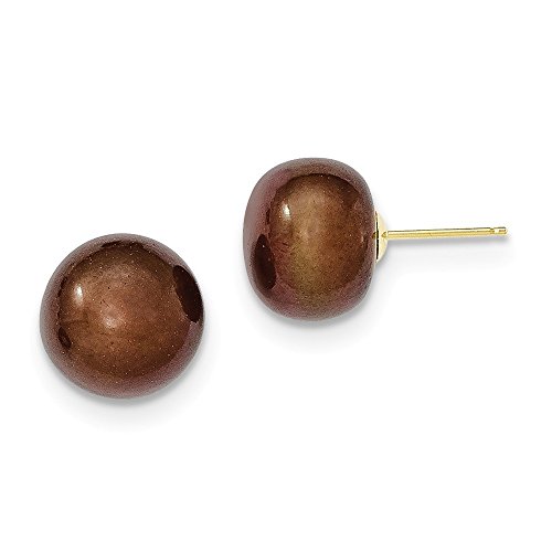 Solid 14k Yellow Gold 11-12mm Coffee Button FW Cultured Pearl Stud Earrings