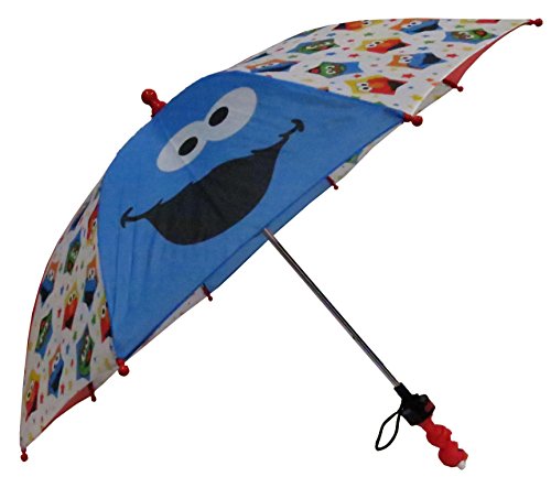 -. Feature : 8 section umbrella with screen printed artwork of Elmo and Cookie monster from Sesame Street, each on 3 panels, and Elmo, Cookie monster and Kermit the Frog in stars on every other panel, / Polyester material. Features Red plastic safety caps and Red 3D Elmo handle. Attached Red nylon carrying cord and Red Velcro closure strap for easy storage and transportation, / One size. Designed for toddler and little Boys aged 3-7. Approximate Size: Closed umbrella - 22" (L) x 2" (W). Open umbrella - 27" (L). Handle - 4.5" (L) x 2" (W) / Care instructions: Wipe with damp cloth. Do not put away when wet, / Officially licensed Sesame Street product,