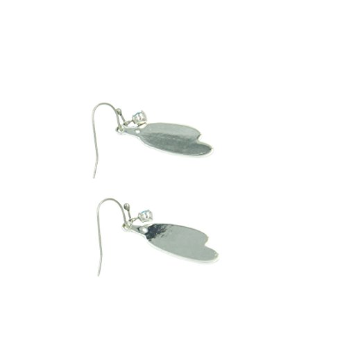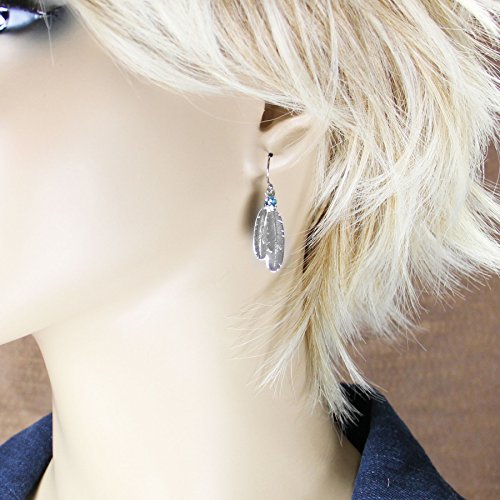 A set of small silver finished double feather earrings with a small light turquoise colored Swarovski® Crystal dangle. Earrings hang from French hooks.