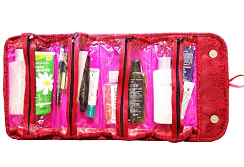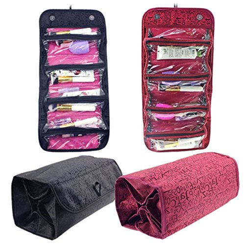 -. Feature : With a convenient hanging loop to hang the bag on the wall. / Roll-up folding style, easy to carry. Superb compact size, great for travel essential bags / 4*transparant PVC zipper pockets built in, clear veiw and do effiecent organize work / Aprox Size Fold Size:25*13.5*4CM;Unfold Size:Length 51CM,Width 25CM / Multiple pockets inside,classify to storage your personal small stuffs. Perfect for you to hold the cosmetics, toiletries, jewelry and more.