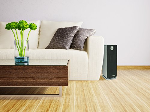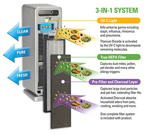 The 3-in-1 True HEPA Air Purifier is perfect for allergy sufferers. With a True HEPA filter, it captures 99.97% of dust and allergens as small as .3 microns in size! According to the American Academy of Pediatric Allergy and Immunology, doctors recommend HEPA air filtration to reduce exposure to indoor asthma triggers. More than just a filter, the UV-C light kills germs, while the charcoal filter captures odors. CADR Rated 100+ and standing 22 inches tall, it is lightweight and ideal to use in both small to medium rooms. The easy to use controls include UV-C control and 3 speeds, including a low speed that runs ultra-quiet. The simple, stylish design looks great in any home environment.Feature