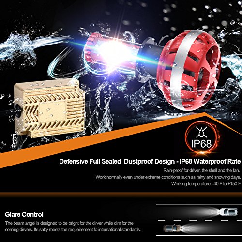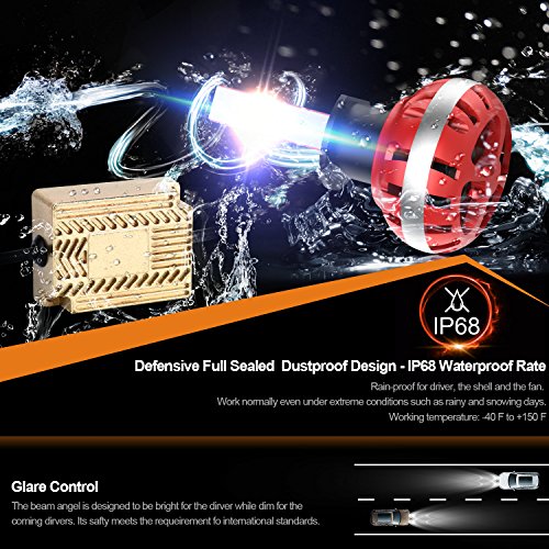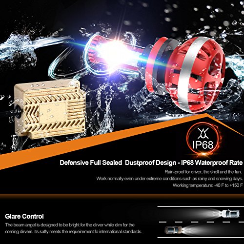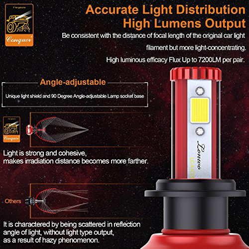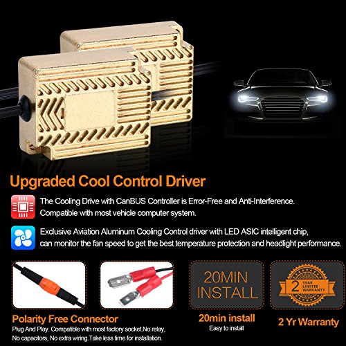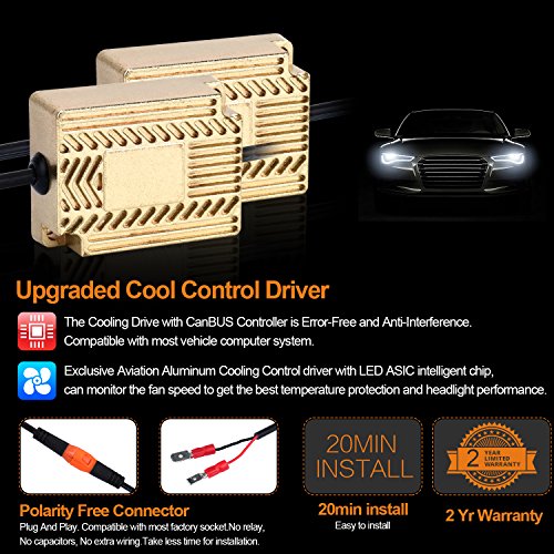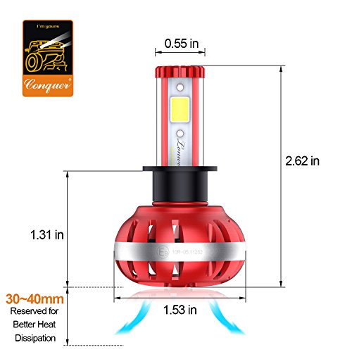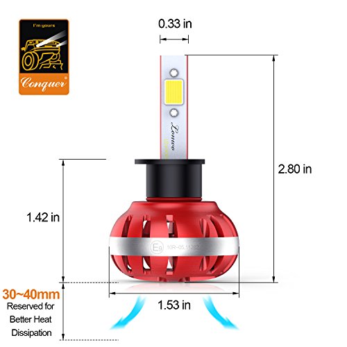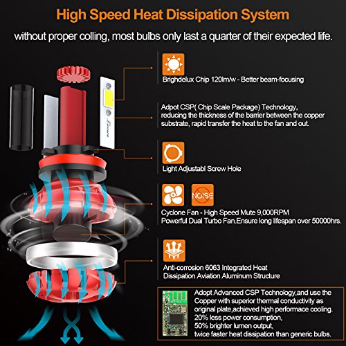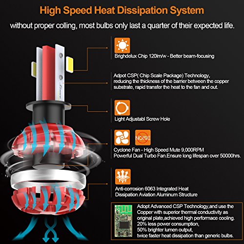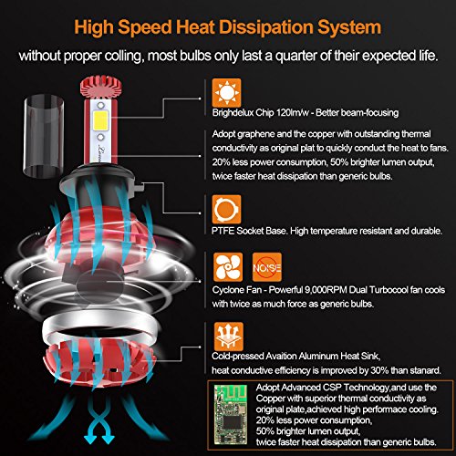 Updated Version High Power LED Chips Updated version with further-optimized headlight beam pattern and cooling performance. CONQUER A2 led headlight bulbs are tested to strict specifications in 3 areas : optics, load, and thermal efficiency. Aluminium Alloy COOLING SYSTEM Aircraft grade Aluminium Alloy heat sink and Japanese double ball cooling fan with 9000 RPM for heat radiation 30% cooler than standard, to ensure secure temp range and long lifespan up to 50,000 hours.
