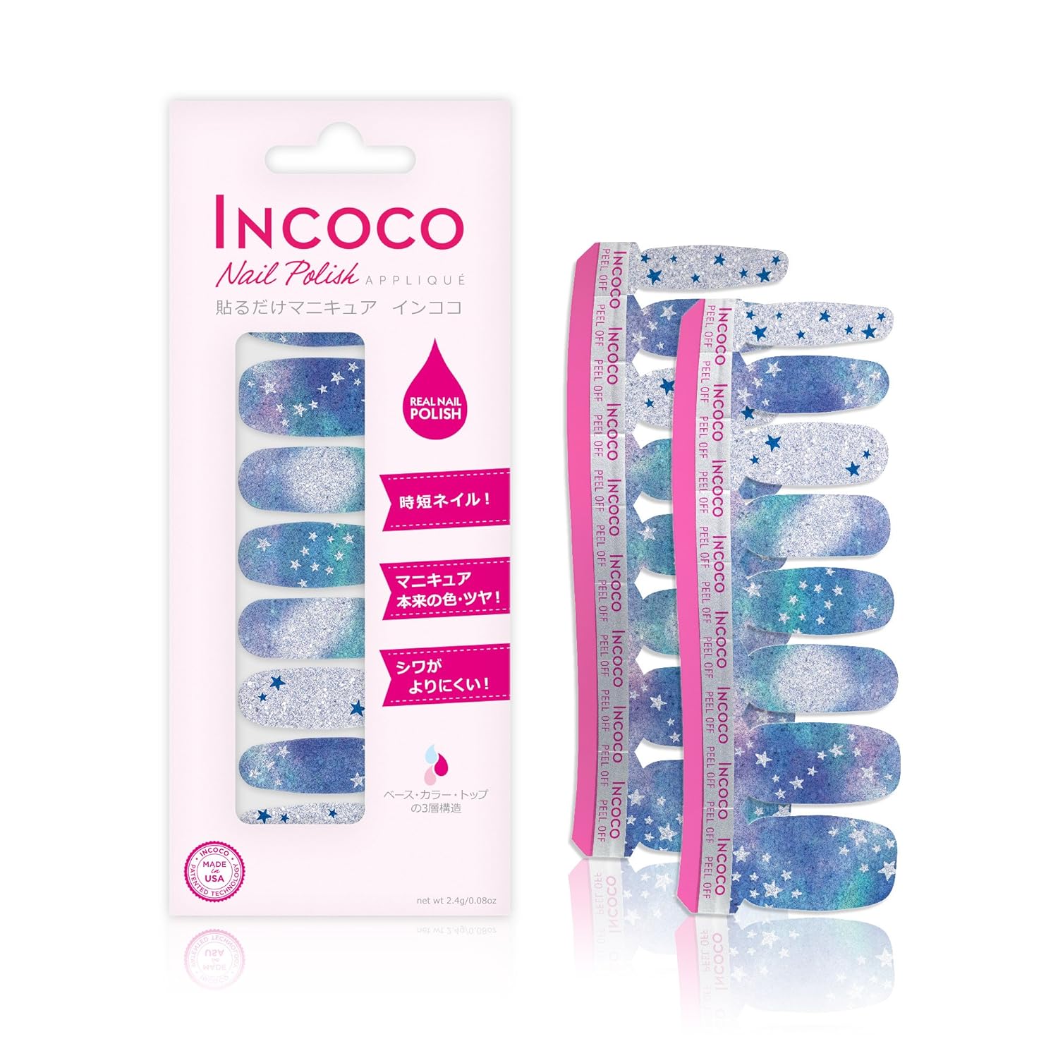 アメリカ生まれの貼るだけマニキュア 「インココ・ネイル・ポリッシュ・アップリケ」(Incoco)はマニキュア成分でできたシートタイプのマニキュアです。乾かす時間不要、塗りムラ知らず、且つマニキュアならではの発色やツヤを楽しめます。インココでまったく新しいマニキュア体験をしてみませんか!アイスブルーのラメに宇宙風デザイン。”星に願いを込めて・・”何か願いがあるアナタにオススメ!ブルー系グラデと星モチーフがクールなポイントでブルー系が好きな方へイチオシです。