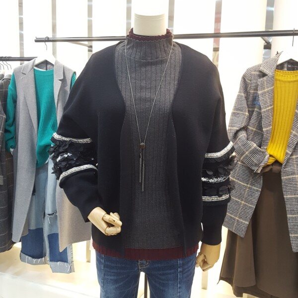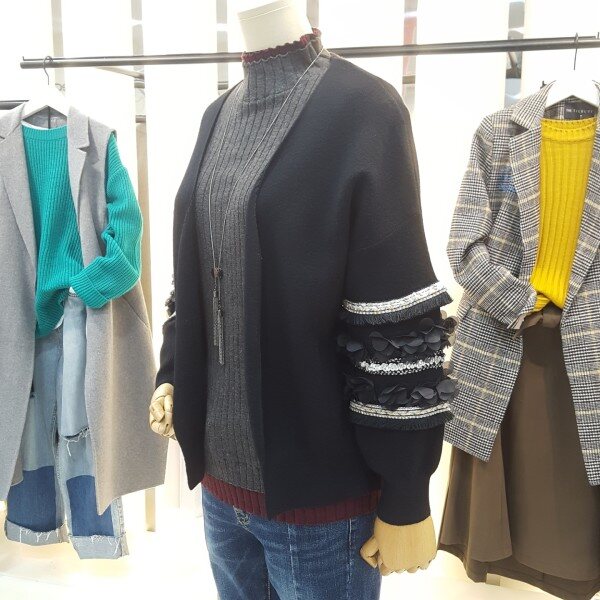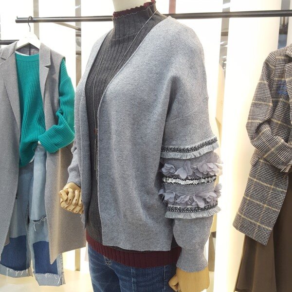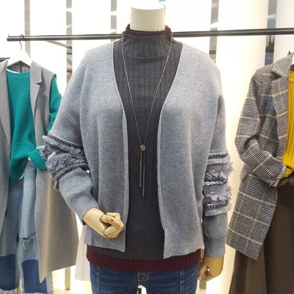 얇팍한 두께감에 자연스럽게 말리는 앞라인이 여성스럽고 소매부분 비죠장식과 레이스꽃장식으로 고급스러움을 더한 매력적인 디자인입니다.밑단사이드트임으로 활동성이 좋고 모혼방으로 포근하며 보들보들 매끈한 아크릴소재가 산뜻한 착용감을 드립니다.